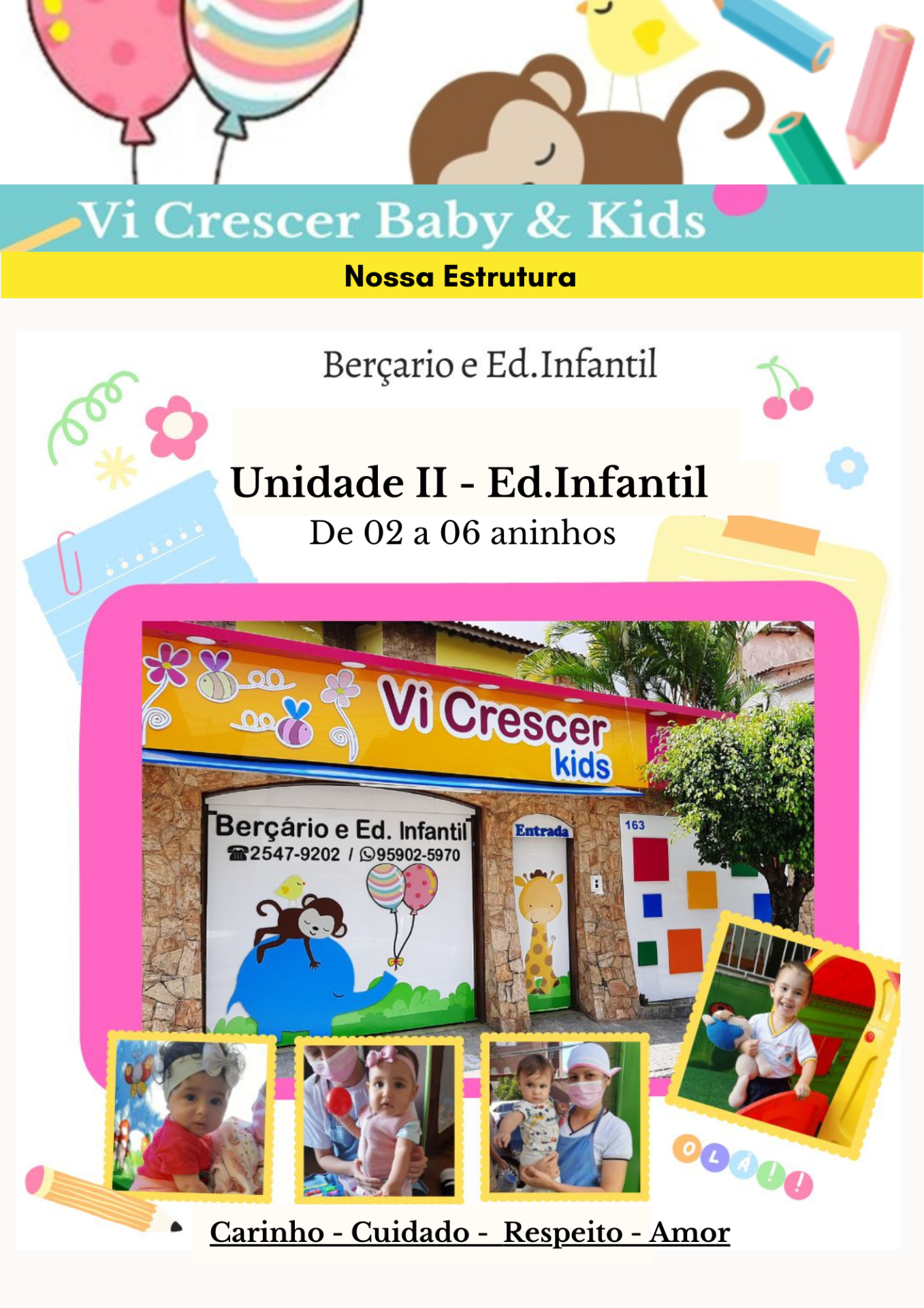 Escolha um lugar que o seu filho seja bem cuidado, muito amado, respeitado e se desenvolva com toda liberdade. Um lugar que deixará seu coração quentinho de tanta confiança e tranquilidade. Um lugar que além de transmitir confiança, transmita muita paz, com equipe capacitada para amar o seu bem maior.